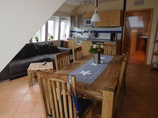 Die helle 65 m² Ferienwohnung mit Meerblick und möbliertem Balkon bietet einen gemütlichen, großzügigen Wohn-/Essbereich mit integrierter Küchenzeile.