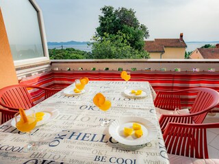 Wohnung Fredy: (4+1) befindet sich im zweiten Stock der Villa und hat 64m². Man betritt den Haupteingang und gelangt über die Innentreppe nach oben.