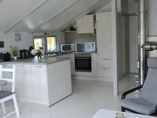 Eine offene moderne und vollständig eingerichtete Küche mit Esstisch lädt zum Kochen ein. Im Wohnbereich befindet sich ein Kaminofen, eine gemütliche Sitzecke...