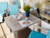 Genießen Sie einen gemütlichen Wohn-Essbereich und einen Balkon mit Teakmöbeln.