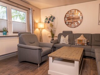 Kernsaniertes Ferienhaus mit moderner Einrichtung: Highlight ist das großzügige Wohnzimmer mit Sofalandschaft und Lounge-Sesseln vor dem Kaminofen.