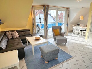 Entspannen Sie sich in einem großen Wohnzimmer mit einem gemütlichen Balkon für frische Luft.