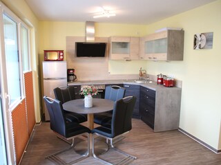 Genießen Sie eine voll ausgestattete Küche und ein großes Ledersofa zur Entspannung.