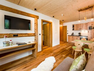 gemütlicher Wohnraum mit Couch und TV – komplett ausgestattete Küche mit Küchentisch