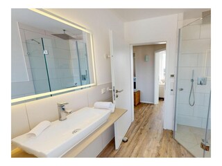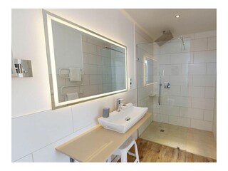 Entspannen Sie in drei Badezimmern mit Regenduschen und einer Whirlpool-Badewanne.