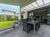 Villa mit überdachter Terrasse und Steg am Wasser