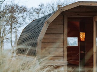 Entspannen Sie sich in einer gut ausgestatteten Küche und genießen Sie die Ruhe in der Fasssauna.